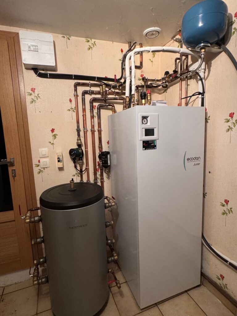 Installation d’une pompe à chaleur air-eau à Préaux , 76160 proche de Rouen. Pompe à chaleur, Mitsubishi, technologie ZUBADAN permettant de chauffer la maison de notre cliente avec la pompe à chaleur, sans aucune perte de puissance jusqu’à -15° extérieur. L’usage de l’appoint électrique est donc complètement désactivé, la pompe à chaleur est complètement autonome […]