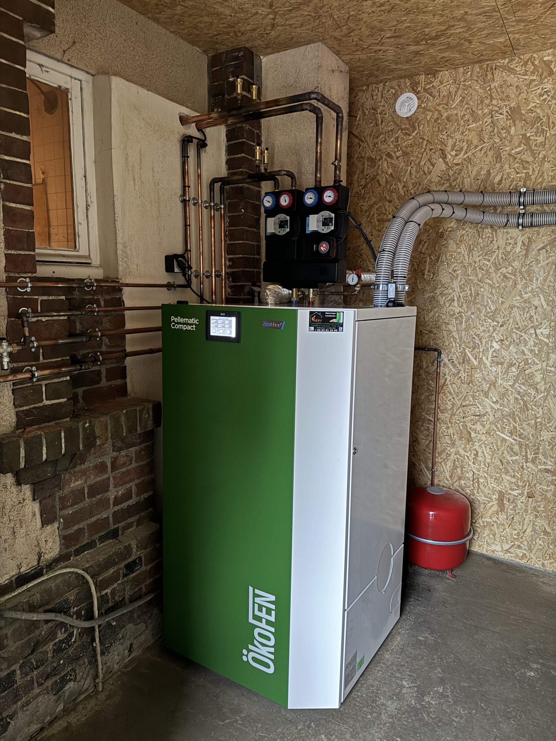 Associer à un ballon d’eau chaude de 300 l et un réservoir de granulés de bois de grande capacité (livraison avec camion citerne, comme le fioul auparavant), nos clients peuvent continuer à vivre sereinement dans cette grande maison de campagne, que nous aurons honneur de continuer à entretenir pour encore des décennies à venir.