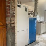 Nous avons pu lui trouver une solution en démontant ce conduit de cheminée et en installant une chaudière à granulés de bois, Easypell fabriqué par Okofen avec un conduit de fumée en ventouse verticale.